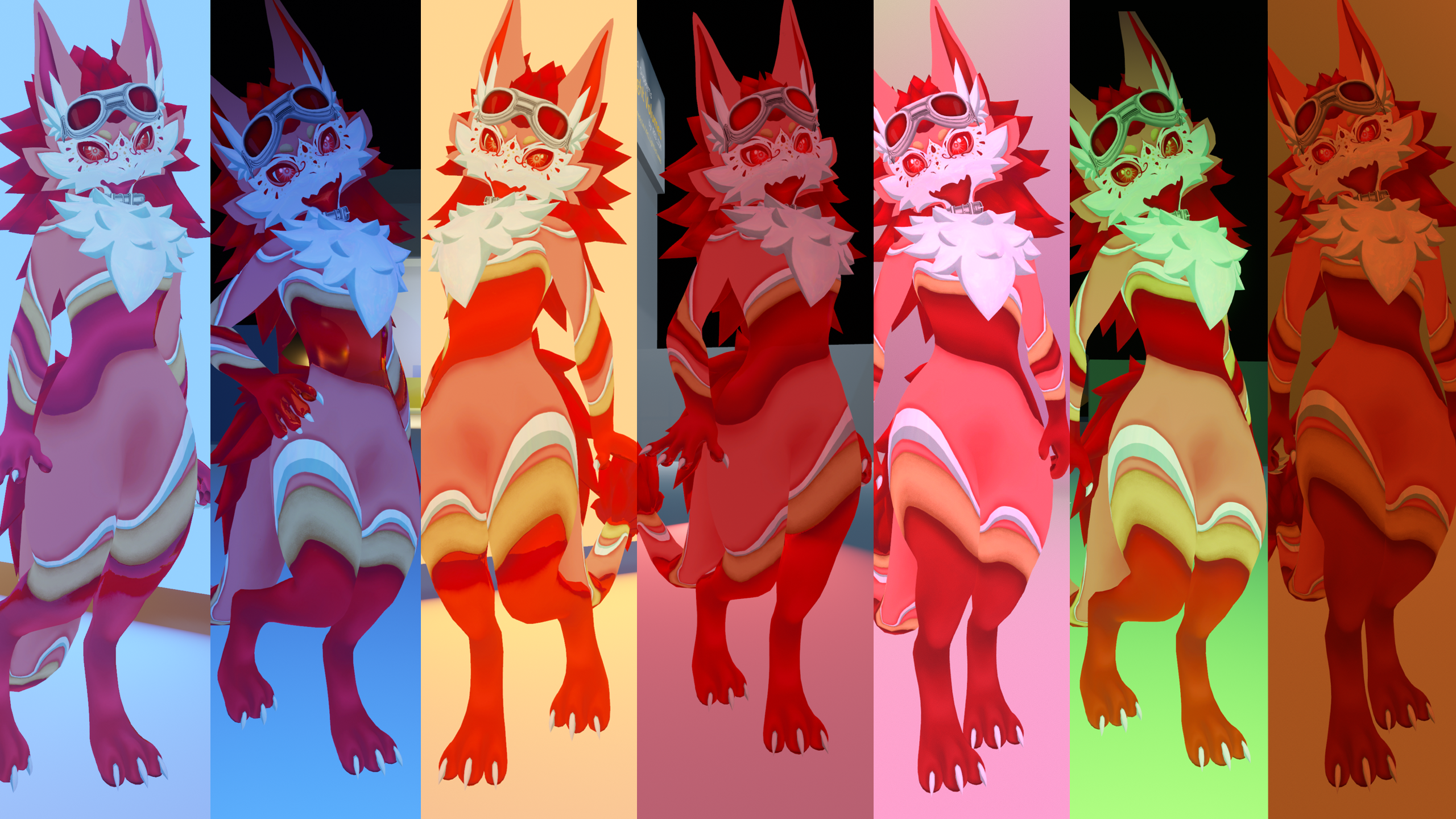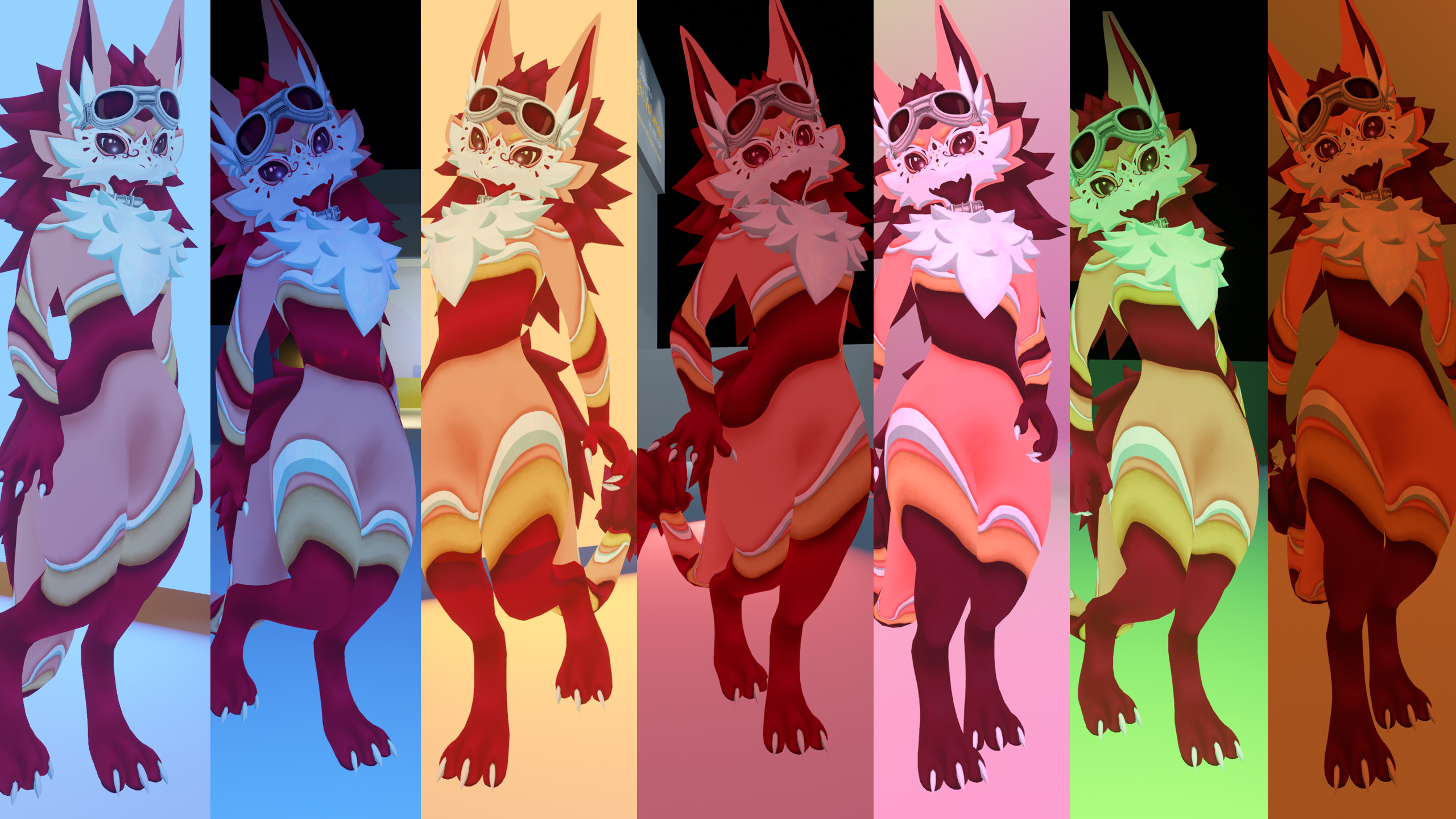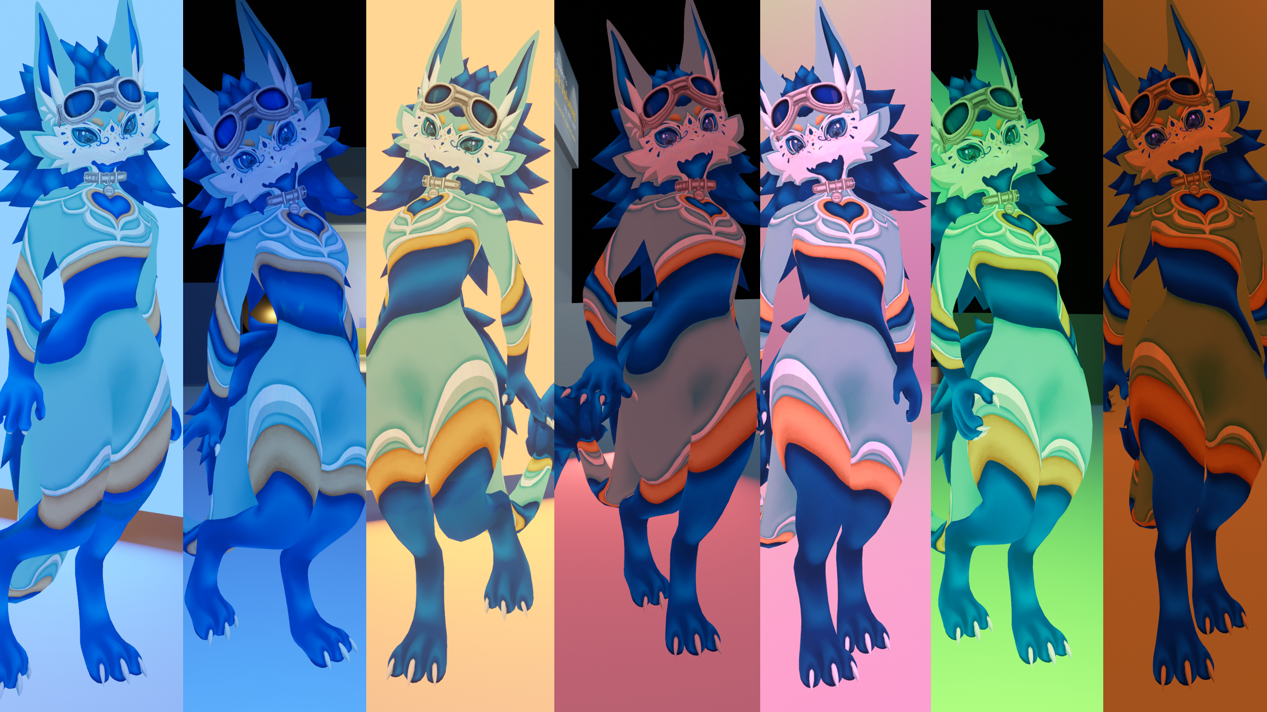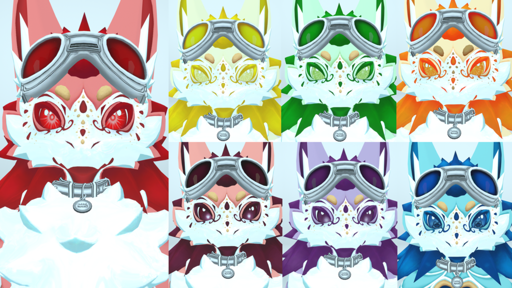 - Material setup with Poiyomi Shaders(with AudioLink): Base, Eyes, Fluff, Visor, Blush